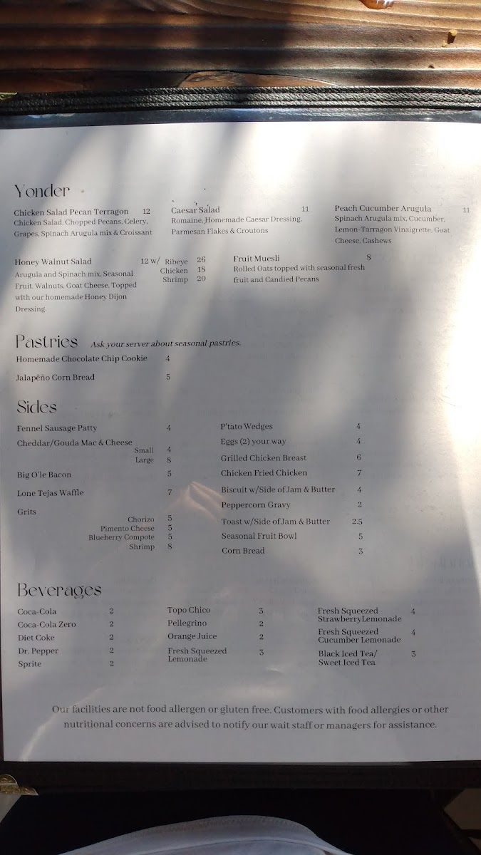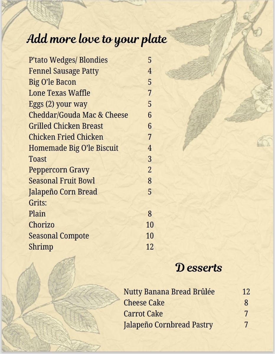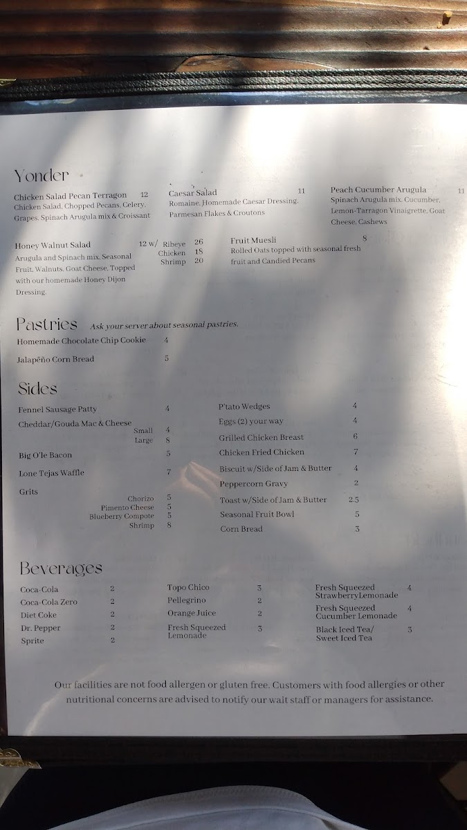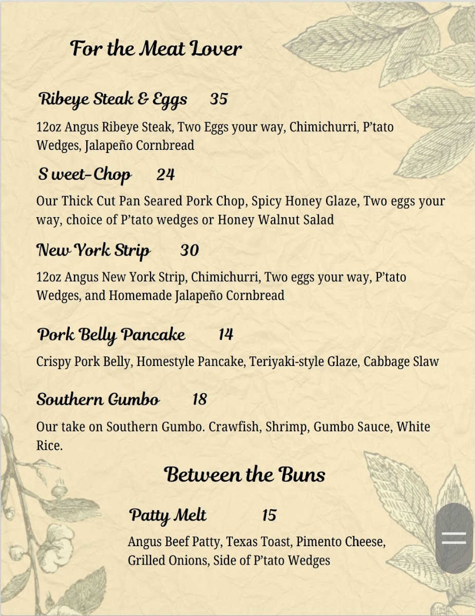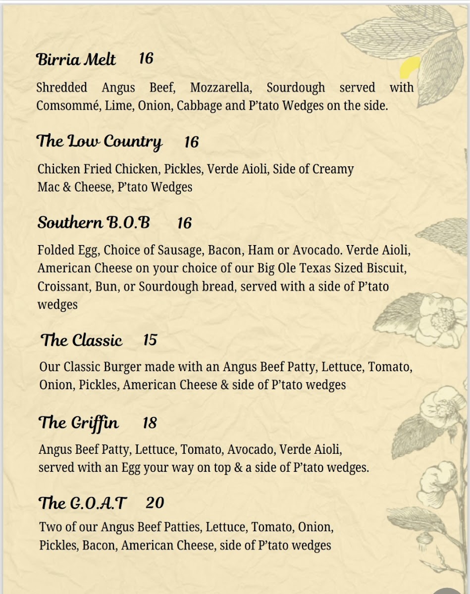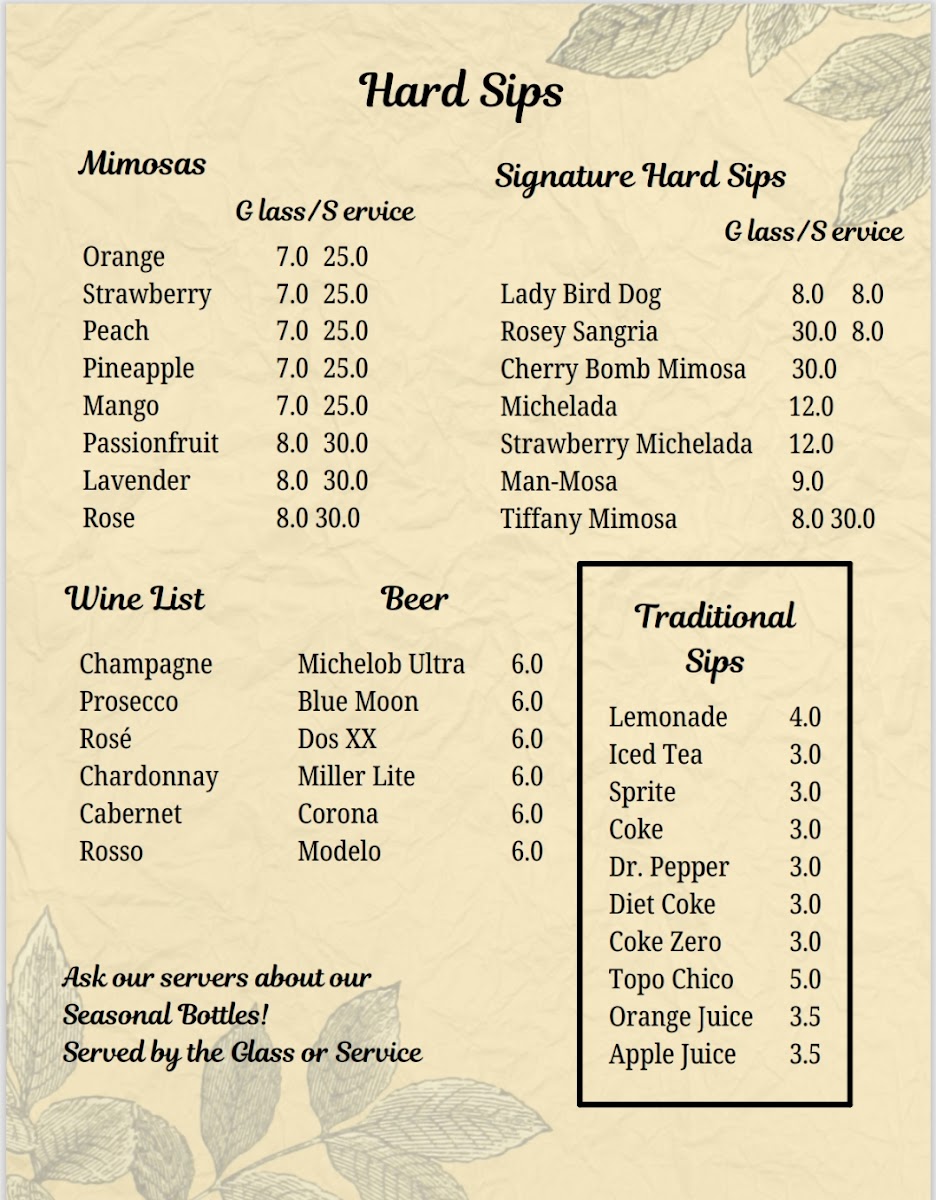 You’ll find hearty plates like Chicken and Waffles or Biscuits and Gravy with Eggs alongside lighter choices such as Garden Omelet and Avocado Toast. Sweet moments come through with French Toast served with peaches and creme or a Texas waffle topped with pecan butter. On the drinks side, casual favorites include a variety of mimosas, from Mango to Lavender, alongside rich coffees and creamy chai lattes. Signature hard sips and a well-rounded wine list add options for those looking to unwind a little more.